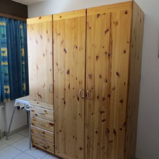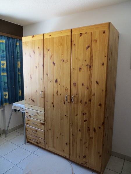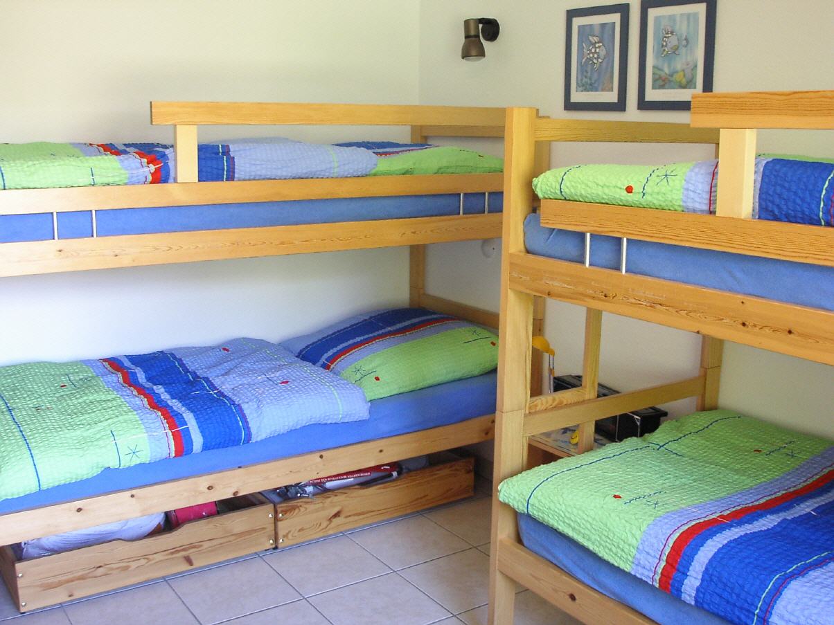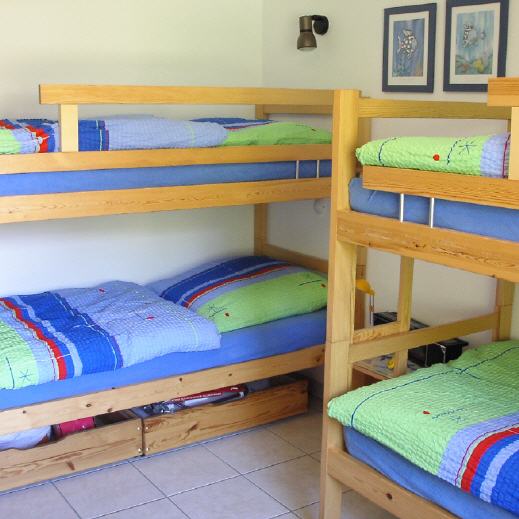Ein Raum mit großem Fenster ist ausgestattet mit Teppichboden, Doppelbett sowie einem großen Kleiderschrank.Der zweite kleinere Schlafraum enthält zwei Etagenbetten für max. 4 Personen (sehr beliebt auch bei Kindern). Ein geräumiger Kleider- bzw. Wäscheschrank ist vorhanden.